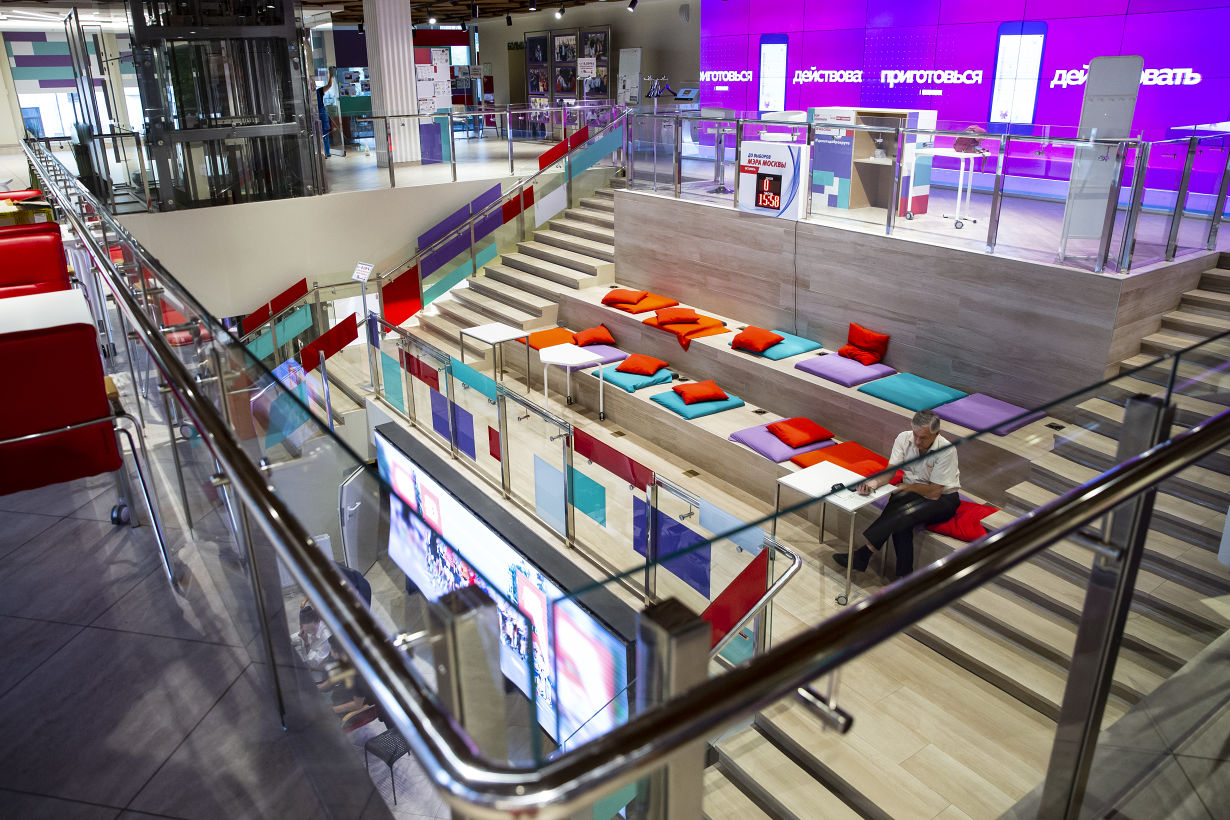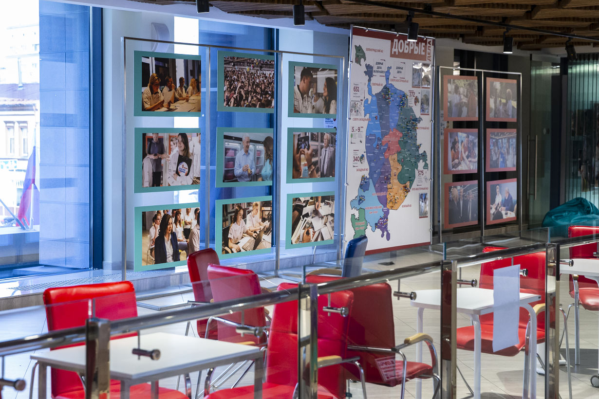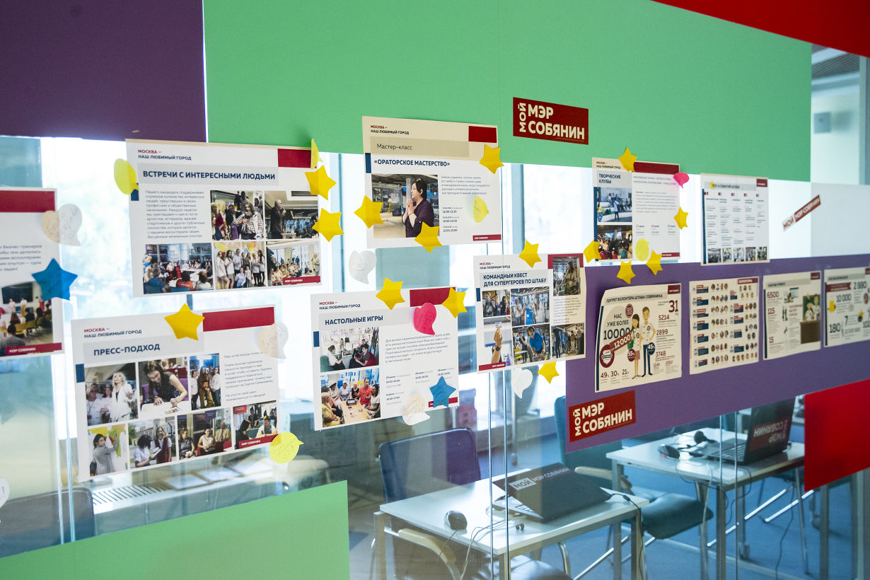 Штаб представлял собой открытое и доброжелательное пространство, которое стало домом для всех, кто хотел поддержать кандидата. Предвыборная площадка вызывала позитивные эмоции, транслировала любовь к Москве, развитие, движение и тепло. Ритмичная быстрая жизнь города нашла свое отражение в дизайне помещения.