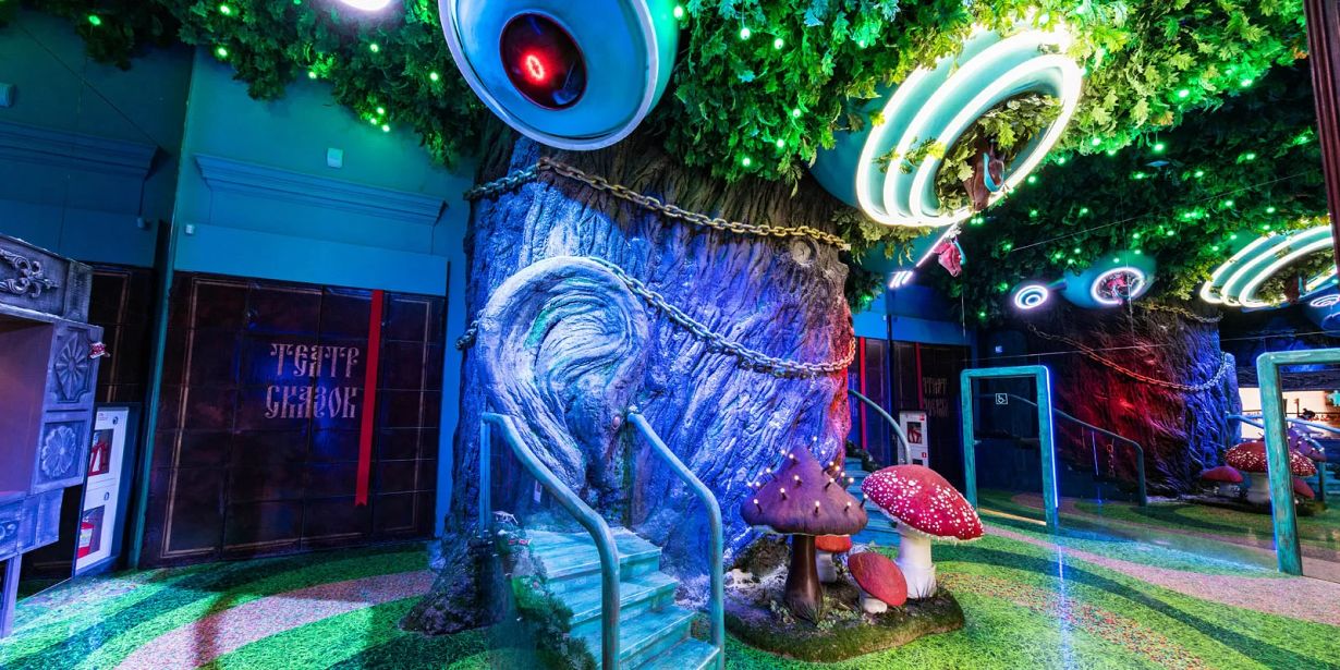 У входа гостей встретят арт-объекты в виде гигантских книг. Погружение в сказочную атмосферу продолжится в фойе, оформленном в виде лесной опушки. В центре установлен волшебный дуб, исполняющий желания. На стволе зеленого великана находится "ухо", куда нужно прошептать самую заветную мечту, после чего нажать на специальную кнопку. Каждое желание учитывается на счетчике, установленном на верхушке дуба. Здесь же ребята познакомятся с аниматроником — подвижной декорацией в виде дракона. Три его головы будут выглядывать из кроны, открывать рты, дышать дымом, а иногда приподнимать очки и показывать огненные глаза.