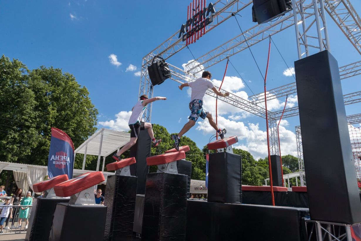 "Арена Героев" — это спортивная зона в Парке Горького общей площадью в 2 000 квадратных метров и 12 самых разнообразных конструкций: прыжки на канате через бассейн с водой, подвесные рукоходы, коварные вращающиеся мостки и многие другие захватывающие препятствия. В прошлом году "Арену Героев" в Парке Победы за два дня посетили почти 2000 человек!